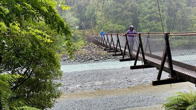 Our path led us out to this swing bridge over the Waiau River. As you can see, it was raining quite hard by this point. Notice the different colours of water in the two channels. The blue-green water is straight from the glacier. The brown water is rain that’s come down through the vegetation, picking up tannins from the soils along the way.