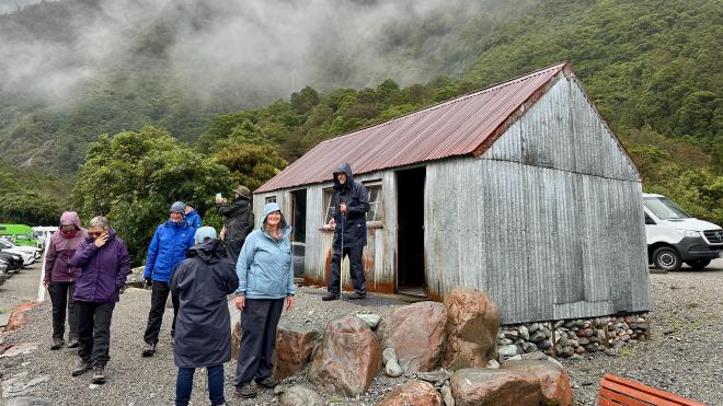 We went back to the van and headed up to the parking lot for the main Franz Josef trail. This building is Defiance Hut, which was built between 1912 and 1913 on Defiance Ridge, well up the glacier. All the materials had to be carried in by hand. It was relocated from the side of the ridge to the ridge crest in 1936 when the receding glacier and erosion put it in danger of collapse, again all by hand. The hut was used until 1974, then moved by helicopter first to Franz Josef townsite and then to its current location, as something of a museum piece.