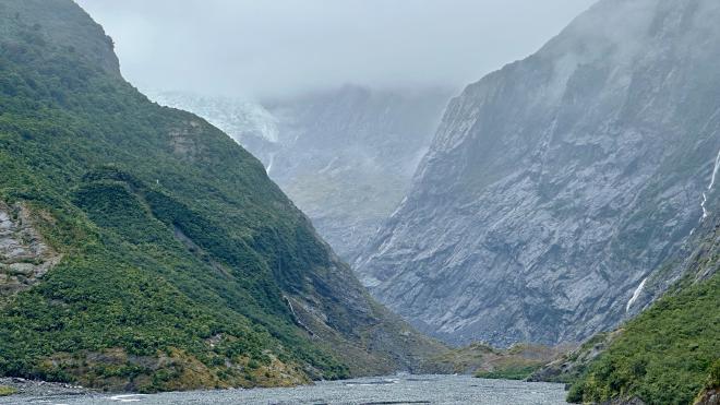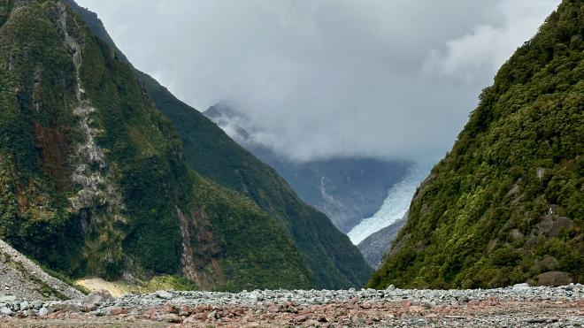From the lookout we headed down to the dry part of the river bed, for a different view of the glacier. The clouds had closed back in a bit, but the lower tongue of the glacier was still visible.