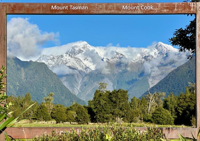 We drove from the lookout to the Lake Matheson parking lot, where group members from the afternoon tour left us and a few joined us for the evening tour. This handy frame, just down the trail from the parking lot, helps you figure out which mountain is which.