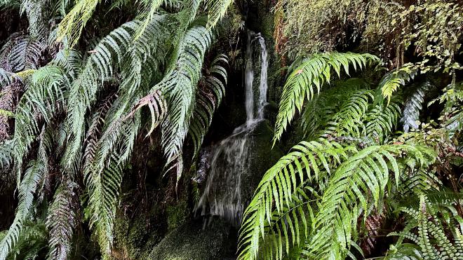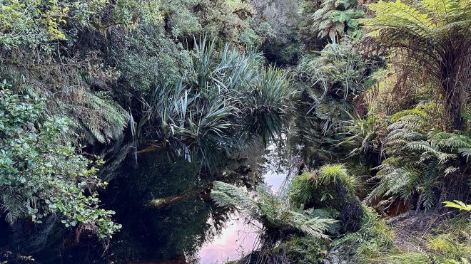Many streams feed into the lake, this one lined with ferns and harakeke.