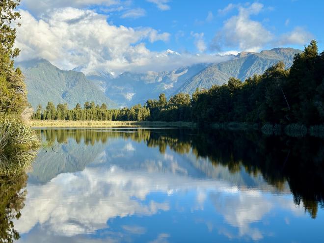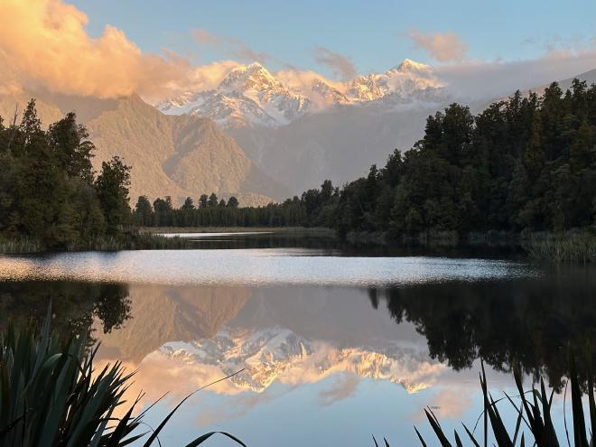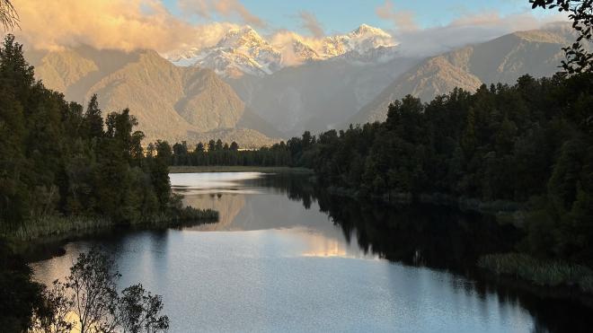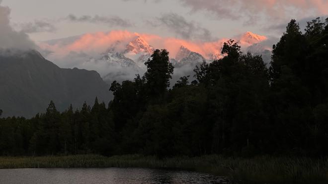 Lake Matheson is fed by rain water, rich in tannins, so it’s a dark brown colour.
