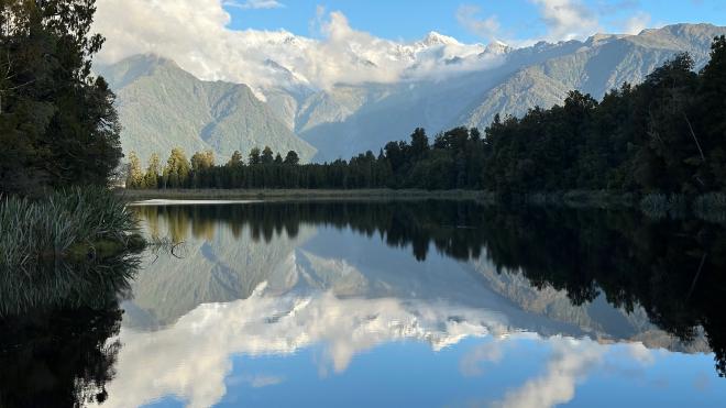 Our third tour of the day was Lake Matheson, also led by Jared. Lake Matheson is much closer to Fox Glacier than Franz Josef, and several of us from the Fox Glacier tour were headed to Lake Matheson. So, rather than drive us all back to Franz Josef and then out again, the tour company sent another van to meet us near Lake Matheson.
