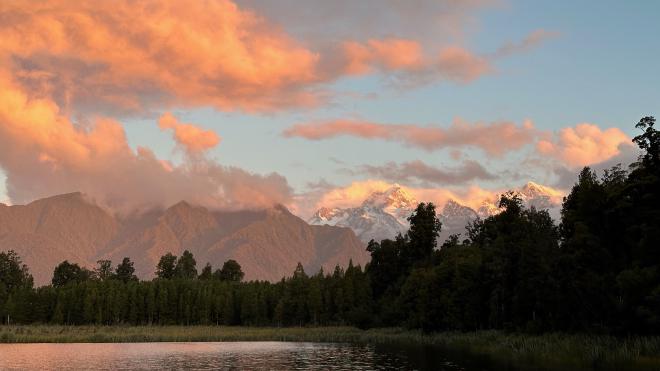 Aside from the lovely nature walk, the main reason to visit Lake Matheson is to see the mountains reflected in its surface. Because of its dark brown colour, it’s a marvellous mirror – as long as there’s no wind to ruffle the surface. The wind normally dies down briefly around sunset, but you never know. At this point there were still quite a few ripples.