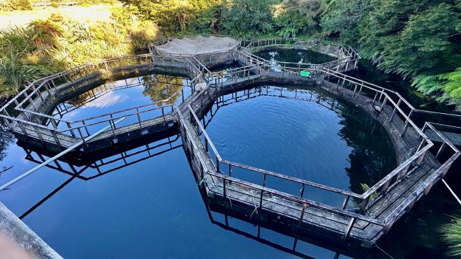 Our breakfast stop was at the South Westland Salmon Cafe, which is unusual in that it’s also a small salmon farm. This is the view from the cafe’s balcony. They serve their own salmon, so of course we had some with cream cheese on a bagel as part of our breakfast.