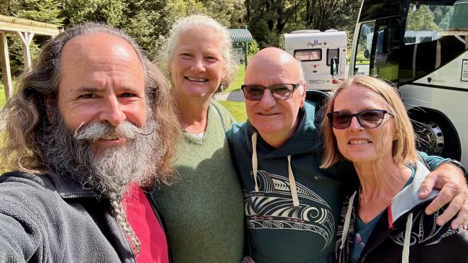 At noon we stopped in Mount Aspiring National Park for a toilet break and to change drivers. A few moments after our bus had stopped, a sixteen passenger van pulled in behind us, and who got out but Martin and Gyl! Greg and Martin were so busy talking that Martin’s driver had to come and almost drag him back to the van.