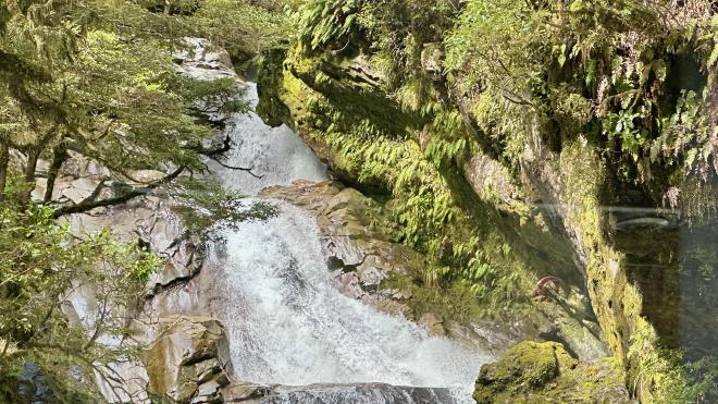 A waterfall, seen out the bus window.