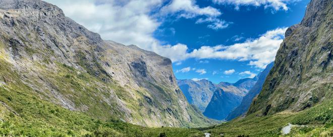 Queenstown is part-way up Lake Whakatipu. Once we’d left the town itself, we headed south around the end of the lake. Our route to the fjord was three sides of a rectangle: south-west, then north-west, then north-east again. Milford Sound is only seventy kilometres from Queenstown in the air, but by road it’s 288 kilometres due to some inconveniently-placed lakes and mountains. But they’re very pretty lakes and mountains, so we forgive them.