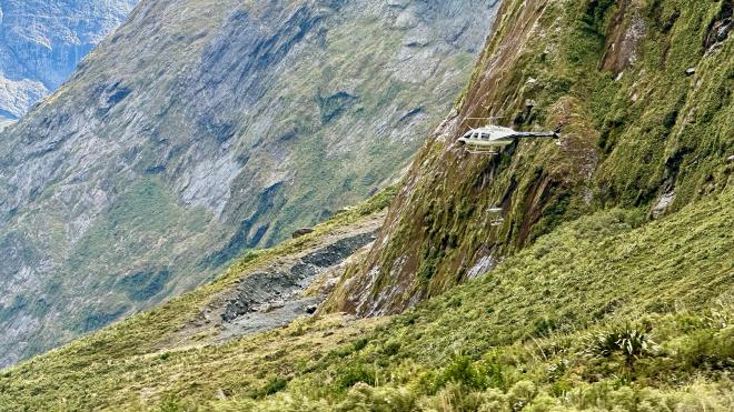 As we approached the fjord, we saw this helicopter with a spreader bucket going back and forth over the hillsides. It was spreading 1080 poison bait, designed to kill invasive species, as part of the New Zealand government’s plans to completely rid the islands of introduced predators by 2050.