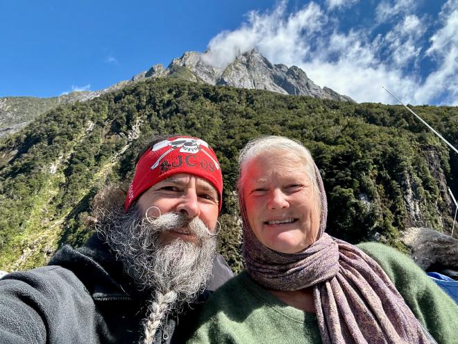 On the way back we had an excellent view of Mitre Peak, which is claimed to be the most photographed mountain in New Zealand. It’s the peak on the right in the photo from the dock, above, and the backdrop for the selfie immediately below that, so maybe the claim is true.