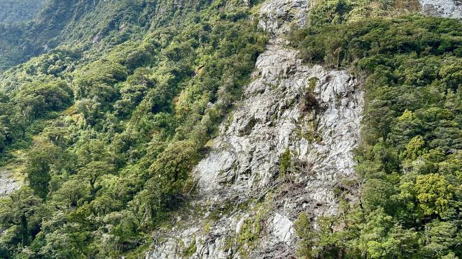 This leads to something called a “treeslide”, which is exactly what it sounds like: a landslide made of trees. Typically strong winds will blow down a few trees at the upper end of a slope, and they’ll begin to fall, taking their neighbours with them and creating a cascade effect. The bare area here is the site of a long-ago treeslide, and you can see the trunks of the trees tangled towards the bottom.