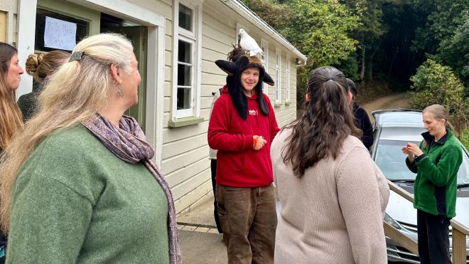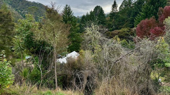 The Festival venue was the Waiora Scout Camp, which is about half an hour outside Dunedin, well in the bush, along a twisty gravel road. Getting there could have been a pain, but the Festival organizer, Xanthe, set us up with a nice guy named Nate with a van, who picked us up at our apartment right around the time we had to check out anyway. Then, after picking up two other people (Nicole and Fluffy) and some bottles of milk for the cafe, we were on our way.