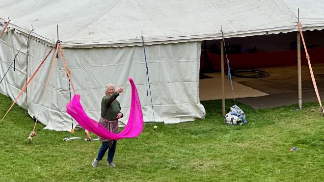 We did get lots of pictures of the “Circus Olympics”, a set of serious-not-serious competitions that were held on the Sunday afternoon. Greg competed in a few of them and had a perfect record, winning none.